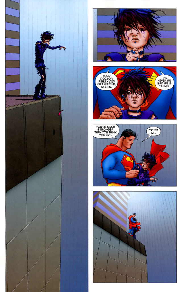 I was never a fan of Superman growing up, he was always to good, to powerful, to pure, but that was the problem with my era, we wanted our Cable’s, the Lobo’s and the ever badass Wolverine, I guess that’s why they wrote Kingdom Come, to show us wear a man of pure heart and nobility would fit in, in a world that wanted the hero to kill the bad guy and be done with it. I know batman is the same, he wont kill, he always find another way but its different with Superman, he can kill but even when he does it hurts him, in many ways he will always show the best qualities of the human species, but tragically he will never be one of us, this film shows that so well and there is a beauty in that tragedy. The film managed to show that for all that power there was a tender heart of a man that cares, below is a picture from a superman comic that shows him taking time out of his day to stop someone from committing suicide, here we have the most powerful entity on the planet and he still stops to look after and guard us, even if we don’t deserve it, he has faith in us, this is the man I saw on the screen today, this is how superman should be done.