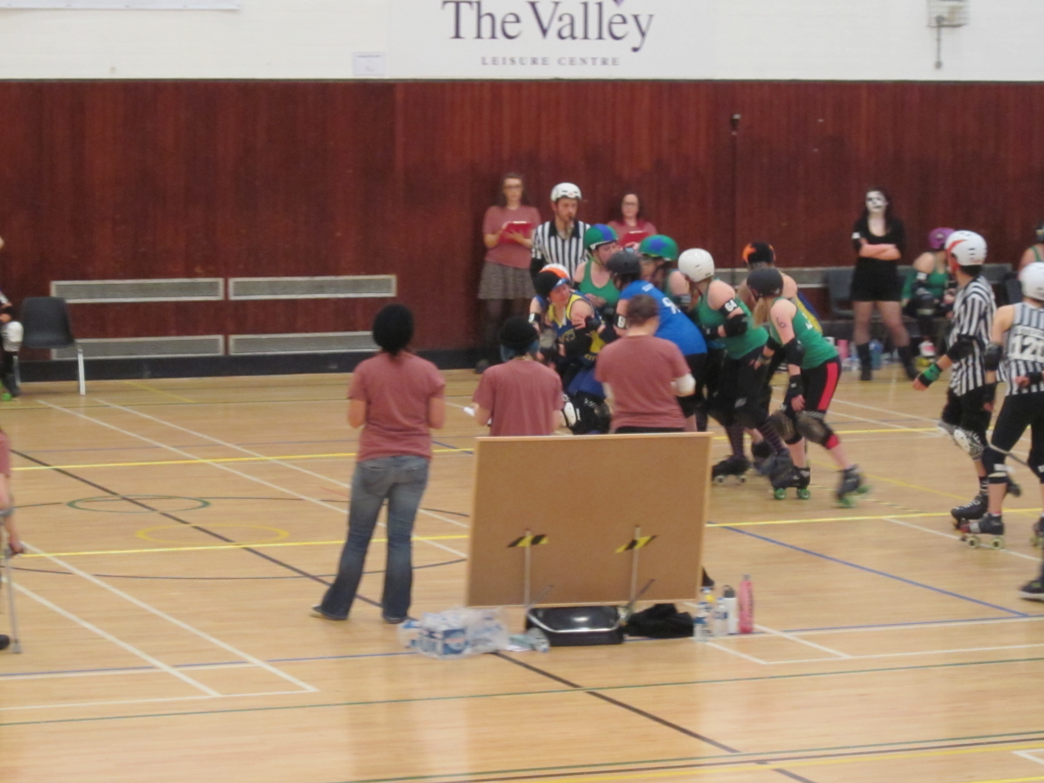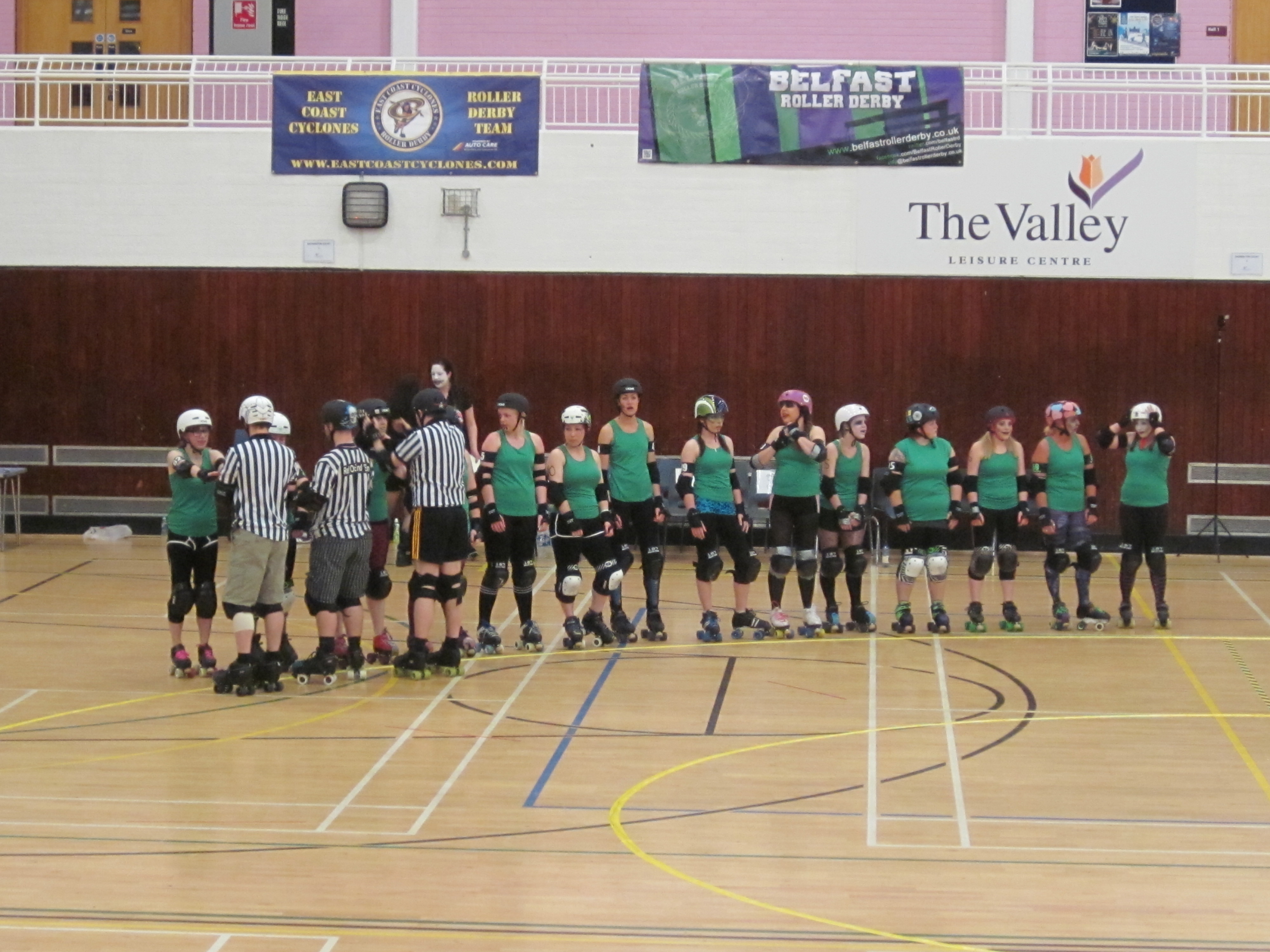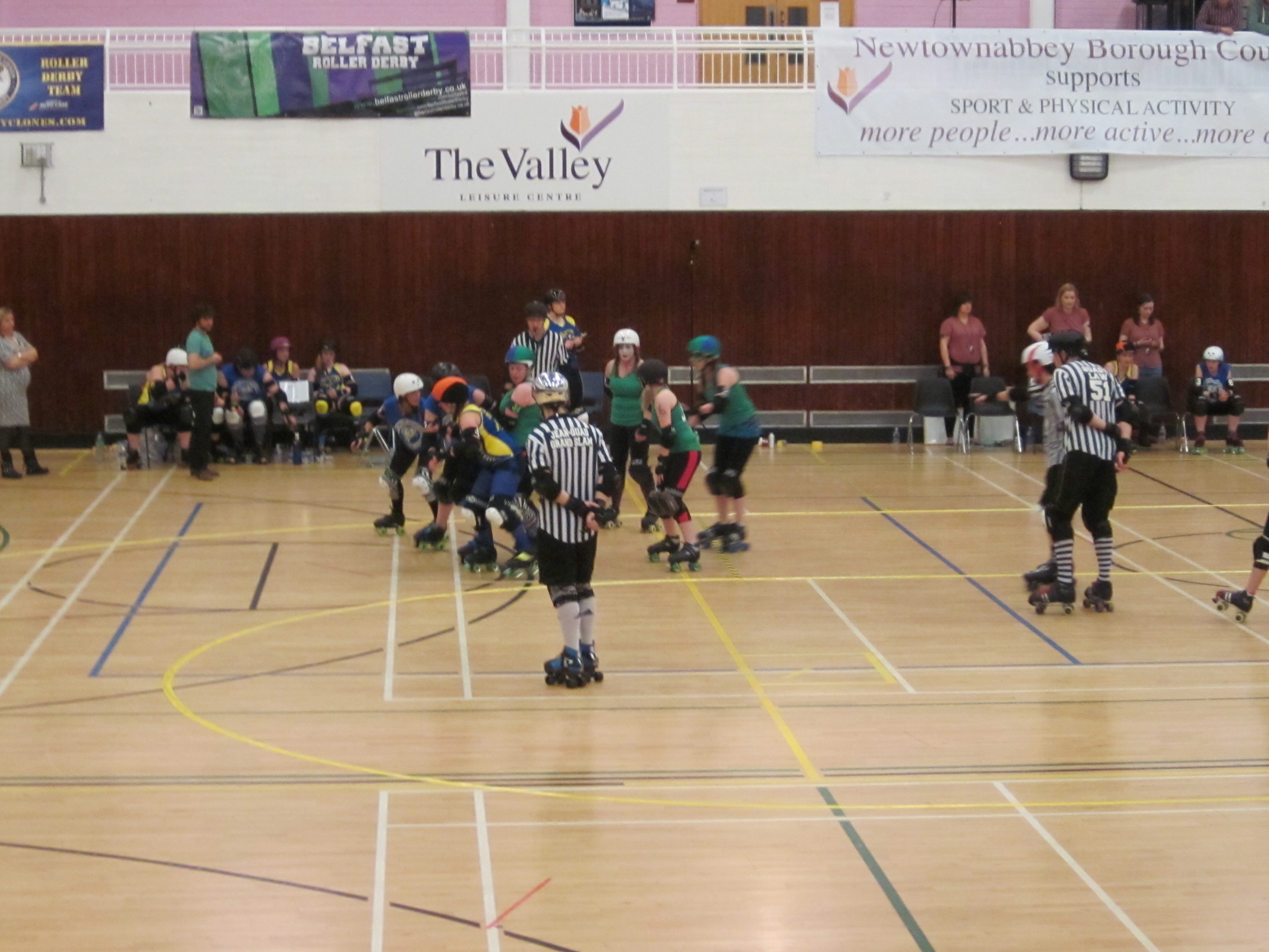 The first match was off to a great start with No 44 – Cleo Smacktra giving us a strong lead, even gaining the home team a 39 point jam in jam nine. The Norn Iron Maidens dominated this match, with great blocking by 64 – Danihell and great jamming by the already mentioned Cleo Smacktra and 62 Moslay. The Cyclones tried their best but in the end we beat them 271 – 200.