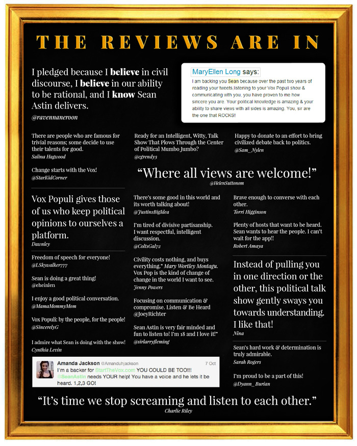 I love this question. I think that people should enjoy themselves. So many of the political platforms available to the public create an uneasiness in the listener. Fear and uncertainty are tremendous motivators, but aren’t likely the most useful tools to growing a community of thoughtful, respectful and more informed citizens. I think that when people first start listening to my show, they are waiting for the other shoe to drop. At the very least, people like to see how I navigate hostile and angry folks into more easy modes of communication. That being said, I think that people should reflect on what they’ve watched or listened to. In the case of Vox Populi, I like that people often say that they found the show refreshing, and informative. I also think that when people make an effort to call in, they feel triumphant. It is exhilarating to share your views in a friendly and nurturing space.