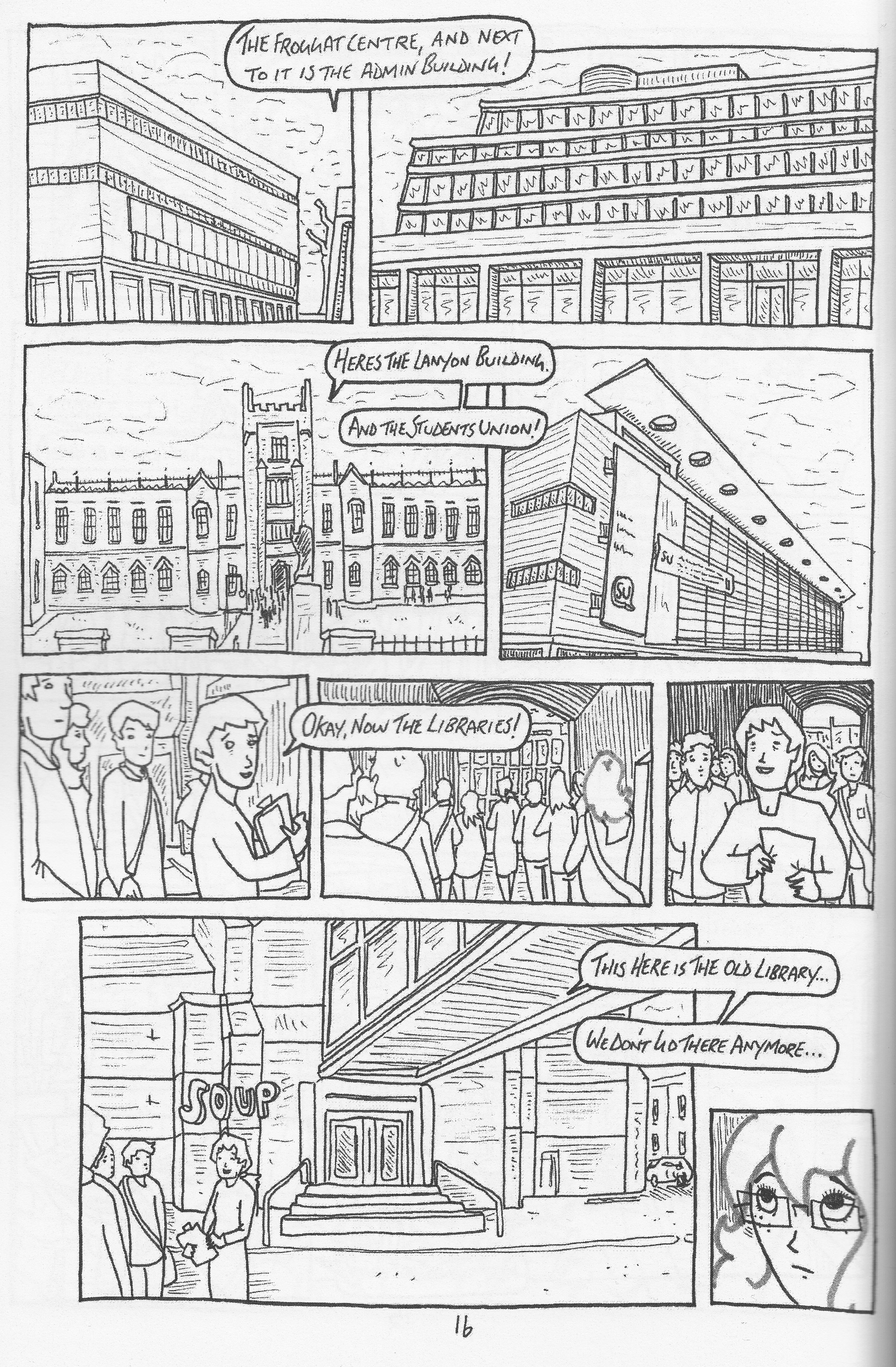 The line art throughout the book is also distinct in quality and style; the drawing is playful but there’s an impressive attention to detail in the illustrations of Belfast, landmarks are instantly recognizable whilst filtered through Megaw’s own unusual vision. Regardless, with or without being familiar with the background locations, the art still draws you in whilst also adding to the comedic tone.