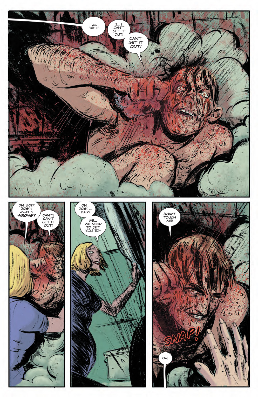 As usual this is where I praise the art work and rightly so, there is something gritty about it and yet defined. The artist has shown us a lot without showing us anything. They have this unique tone set by the colours they use including ones you don’t see in mainstream print. Maybe I’m not explaining it right but it’s like a vibrant, gritty, dullness that just creates a negative feeling within its reader but one you can’t pull your eyes away from.