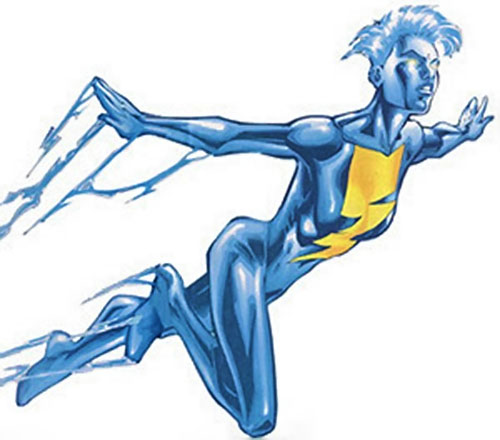 What are their powers/abilities?: Originally, Jolt possessed hyperkinetic agility and could move with amazing speed and jump vast distances. Her hyperactive metabolism made her body’s natural bioelectric field exceptionally powerful, and she could shock enemies with a touch. Moreover, Techno stated that she could transform any kind of energy into physical strength and speed, and that with an unlimited source of energy she would be able to use her powers with no physical strain whatsoever. After her “rebirth”, Jolt could change from flesh-and-blood into living electricity. In her energy form, she could fly and fire blasts of electrical force. At first, she could only function in her electric form, her human form was so injured that she could barely walk and talk. She has now fully recovered, and her level of power has increased
