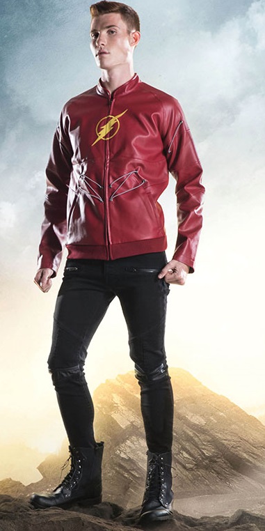 I am 100% sure I could not pull this one off, though it does remind me a little of the Jay Garrick look from the Flash Tv Series. Its bright red faux leather, with a Flash logo, and some strategically placed lightning bolts , its fun and fresh thats true just probably not for me.