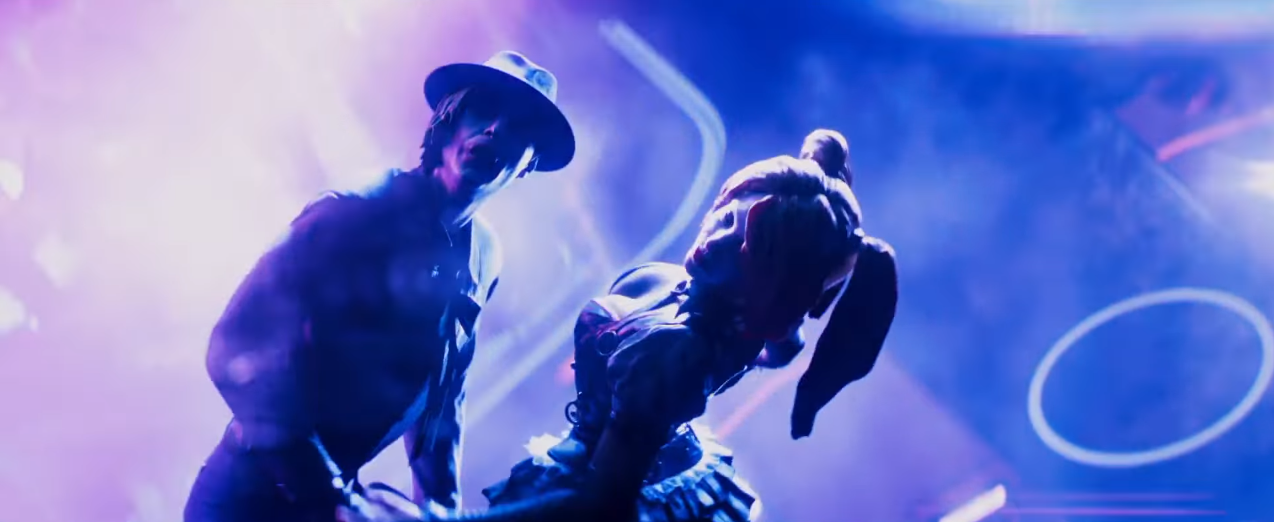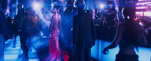 This is an infamous club scene between Parzival and his love interest the arguably superior Art3mis. If you look carefully you will see Blanka behind them and a Bartender with a hat inspired by the band Devo.