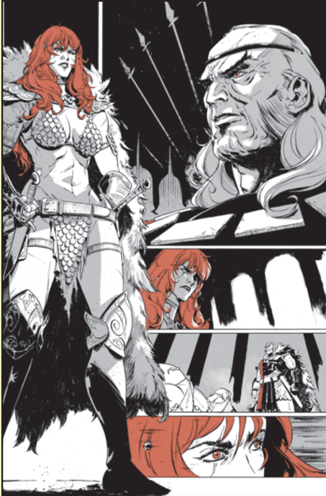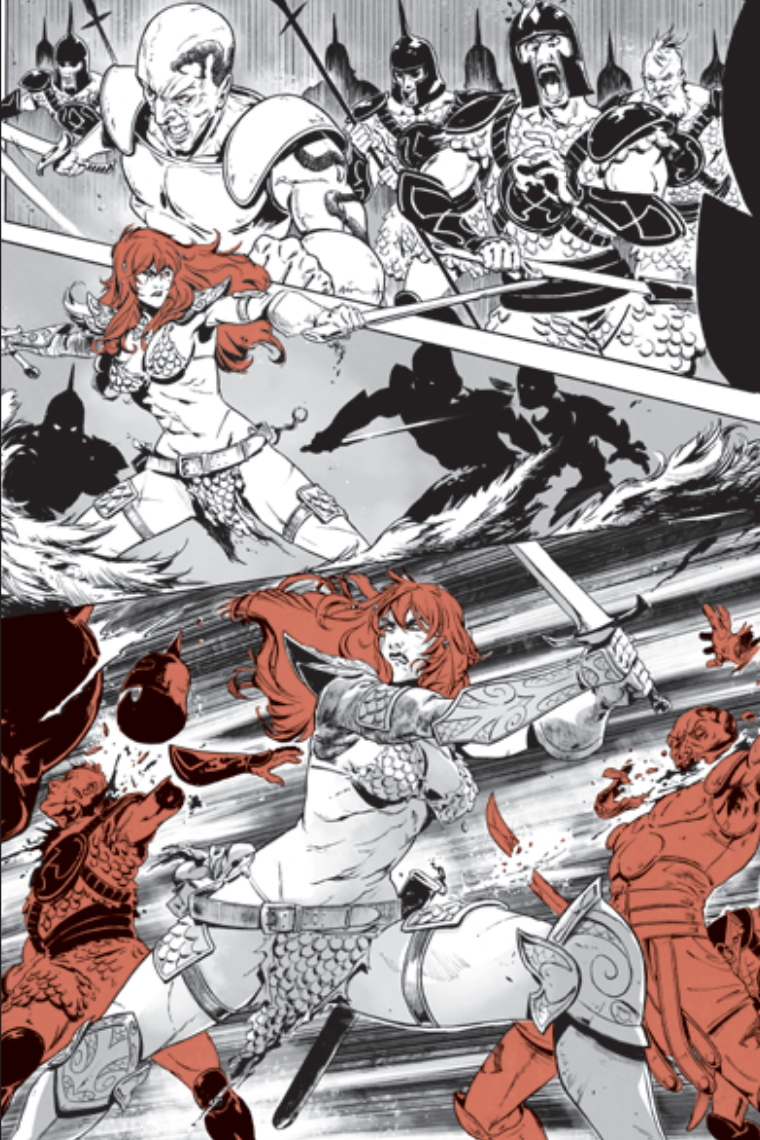 As you can see from the art the book has taken a truly unique look, keeping it Black and White, but using the red to highlight certain areas, which just looks gorgeous. This is all thanks to artists Esteban Moroto (Savage Sword of Conan, Vampirella) and Santi Casas (Batman: Arkham Unhinged). Red Sonja: The Ballad of the Red Goddess will be published as an oversized hardcover in a European format. Never before seen in English, this original graphic novel is an brand new tale