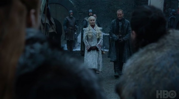 We honestly see very little but what we do see is interesting. We see what appears to be the first meeting of Sansa (Sophie Turner) and Daenerys (Emilia Clark), with an always uncomfortable Jon Snow (Kit Harington) caught in the middle. We do see a very sassy Sansa which makes me wonder at this point who knows what about the bloodlines.