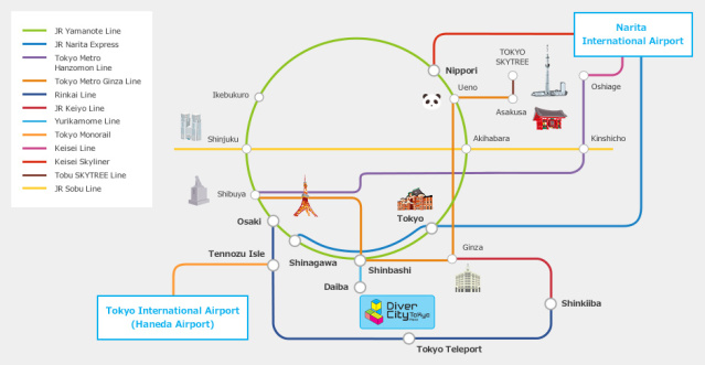 If your looking to get there it’s very easy. Odaiba can be reached in 20 minutes by car from the Tokyo International Airport(Haneda Airport), in 21 minutes by train, and 15 minutes by the Limousine Bus service. From Narita Airport, it can be reached in around 60 minutes by car, in 67 minutes by train, and in 60 minutes by the Limousine Bus service.