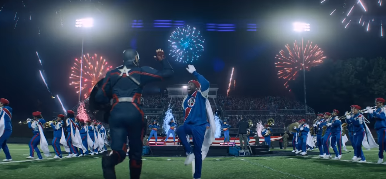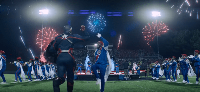 Cut to American Agent – not Sam Wilson, running onto a Football flied being marketed as the new Captain America.#