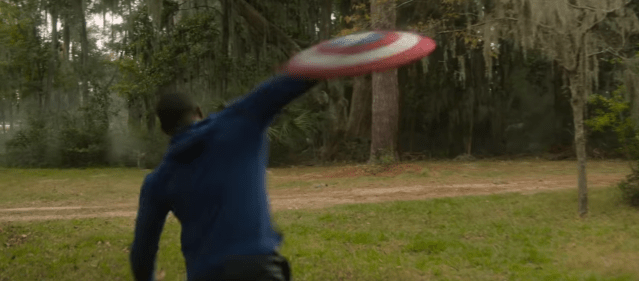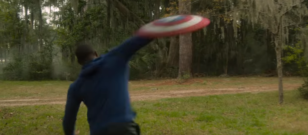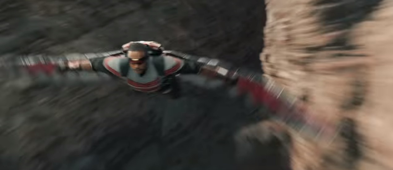 Next we see him chasing a few bad guys through a canyon in his falcon suit and I cannot tell if that is the shield or not on his back.