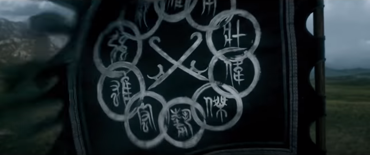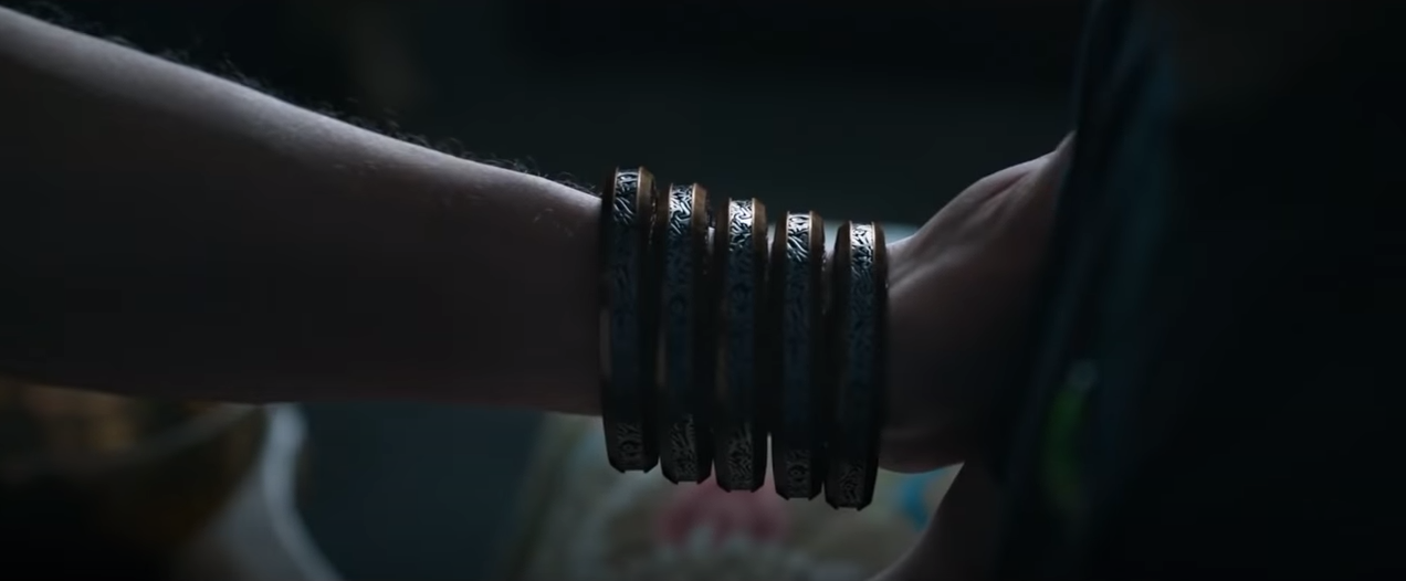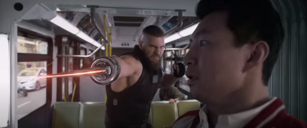 It seems that the Mandarin wants his son back. We know already that he left the organisation to have a normal life, but the first trailer implied that he only he thinks he ran away and that his father knew the whole time where he was. Maybe he wanted his son to get some real world experience and hoped it would convince him to join his organisation. I just love this shot, because you can see him uneasily staring at rings on his fathers arm. It shows that Shang-Chi is genuinely is terrified of him and what he can do.
