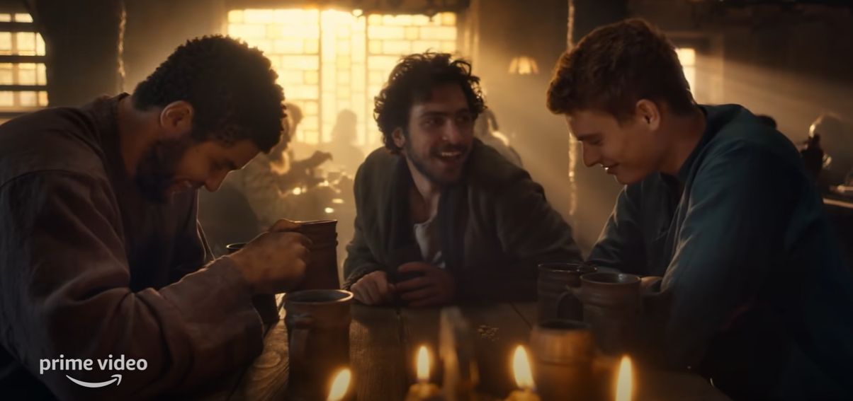 This is a nice shot of our three main male leads all enjoying a happy drink in what I assume is the Winespring Inn, their local tavern. I know some people are not happy with the casting but I really think this is spot on.