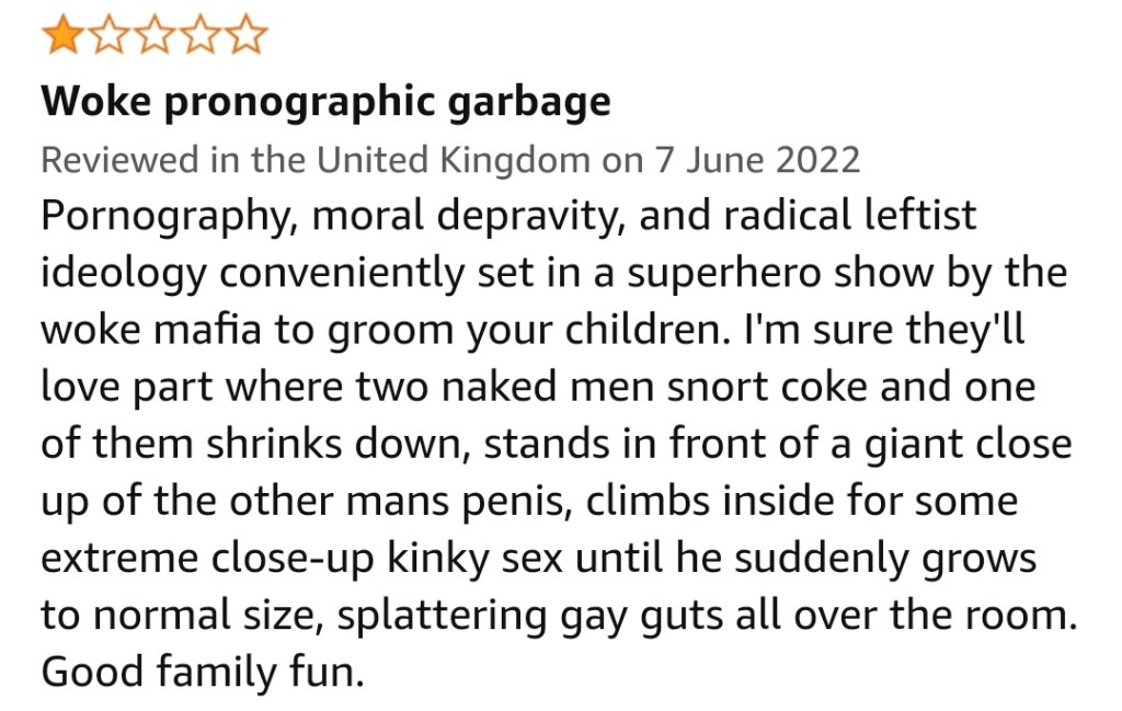 This seems to be the biggest issue. Apparently The Boys is full of “Woke Bullshit”. And yes I have to agree the show is Woke, but it is strange that they are only realizing this now, as the show has always been Woke.