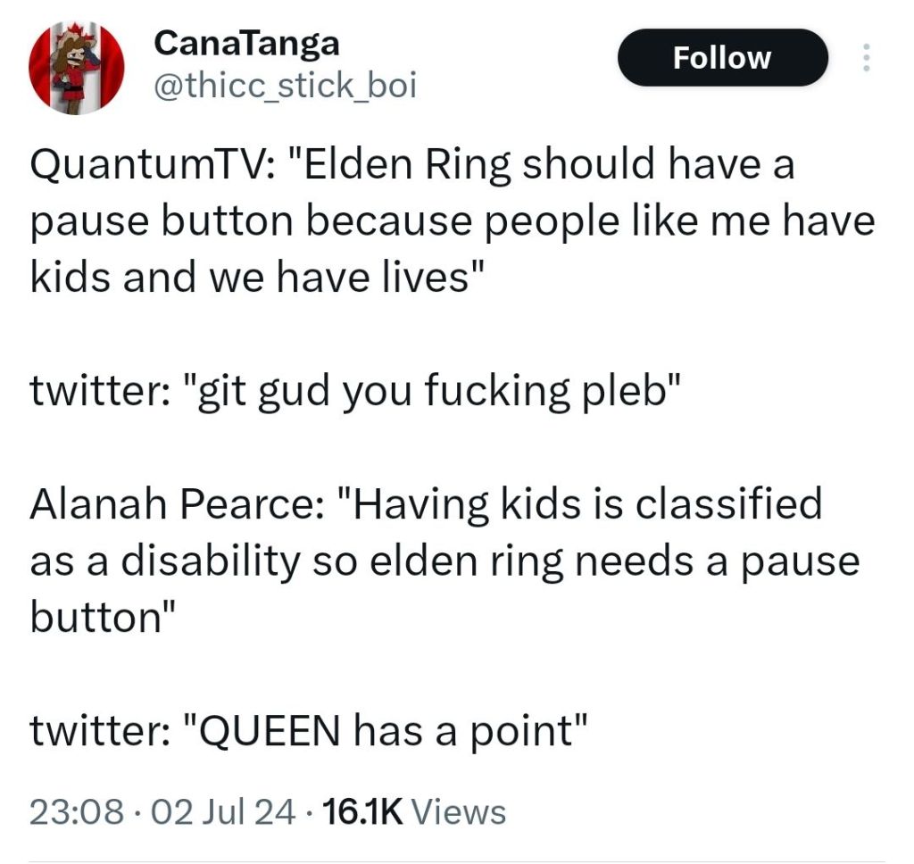 Canatanga clearly needs his ears cleared out. She never says the game needs to be easier. She specifically says that over and over again. What Alannah Pearce actually says is that the game should be more accessible. Alannah repeatedly clarifies this over and over again.