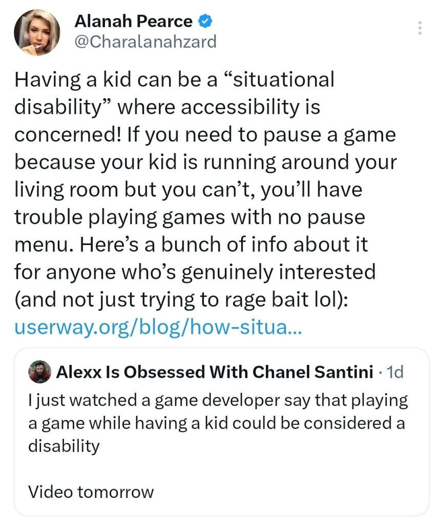 people are missing the bigger picture here. It’s not that Alanah actually believes kids are a disability for gamers, that’s what the industry has taught her and how it classifies having children as lol. Not sure you can really defend a souless corporate entity labeling it that.
