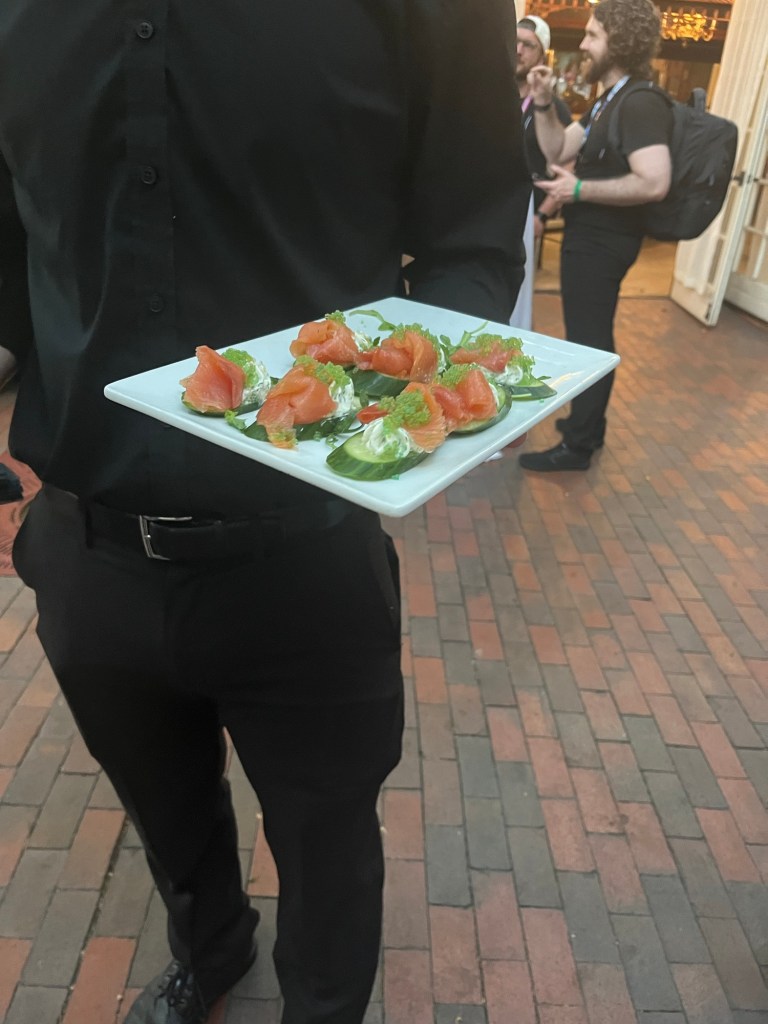 Attendees were treated to delicious appetisers including caprese skewers, mini lamb chops, chicken satay skewers, and salmon cream cheese cucumber bites. Food can often be in short supply at Comic Con parties but Den of Geek made sure the canapés kept coming.