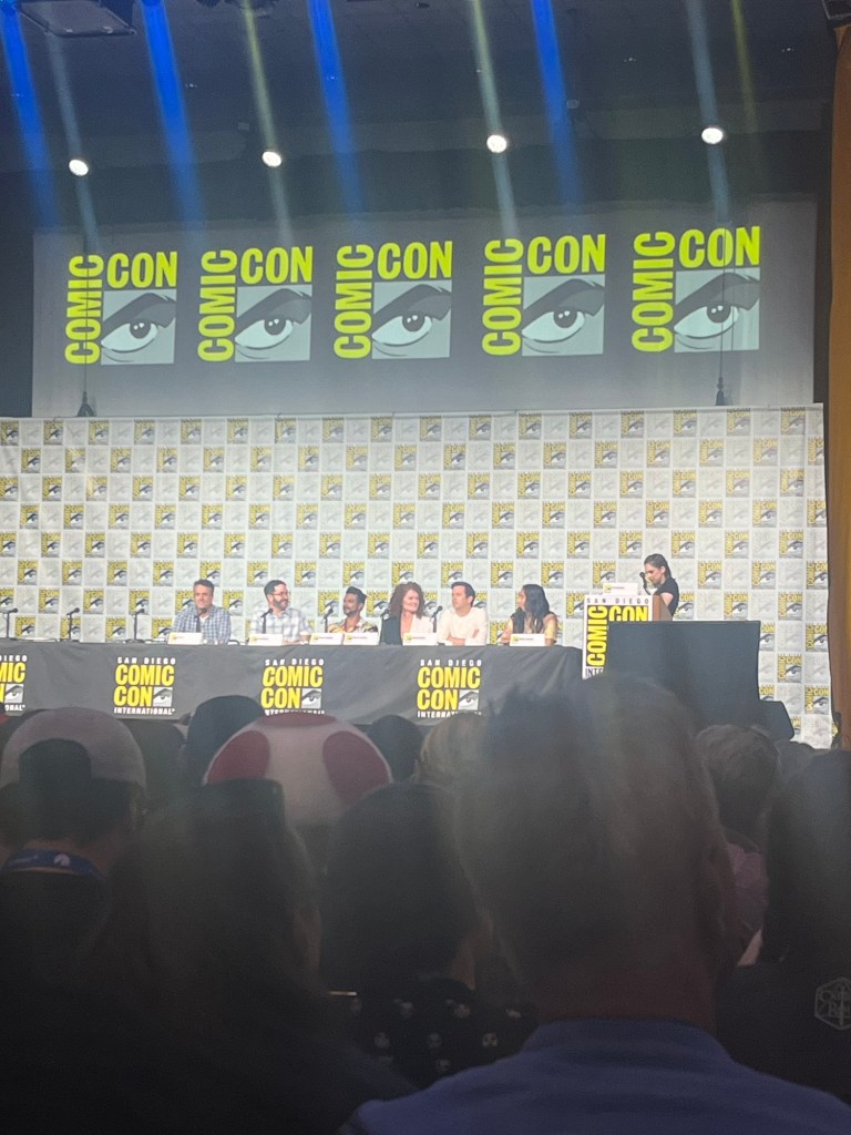 Ghosts made its big return to Ballroom 20 with a smaller cast but just as much excitement and energy. Cast members Utkarsh Ambudkar (Jay), Rebecca Wisocky (Hetty), Roman Zaragoza (Sasappis), and Richie Moriarty (Pete) joined showrunners/executive producers Joe Port and Joe Wiseman to discuss season 3 and look ahead to season 4. The panel quickly revealed the reason for the absence of other cast members – season 4 just started filming last week (the actors themselves have only seen 3 scripts) and everyone else was actually filming. While the others were missed, the crowd were very happy to hear that filming was underway as that means season 4 episodes would be arriving soon.